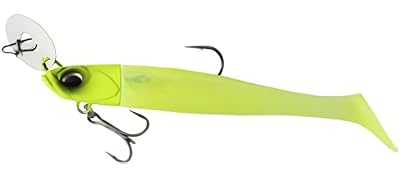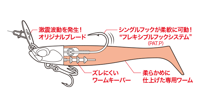ブレード(薄型0.4mmステンレスプレート)が水を叩いて強い波動を発生させ、柔らかめのワームが微振動を加えるため、広範囲から魚を集めることが可能です。
