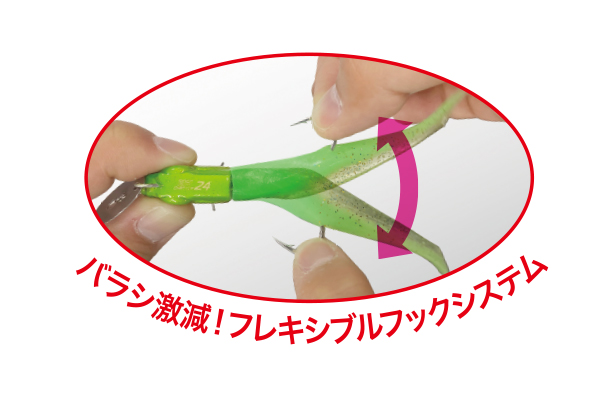 シングルフックが自由に可動するフレキシブルフックシステムの採用により、魚の暴れに追従しフックアウトを抑制。