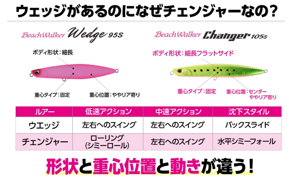 飛距離・安定感・ナチュラルアクション、この3つを高いレベルで両立しているのがビーチウォーカーチェンジャー105Sです。