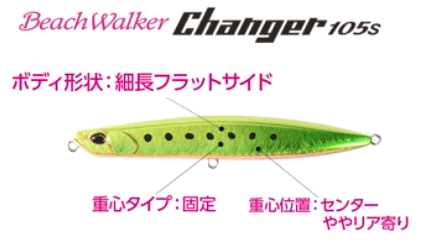 DUOの「ビーチウォーカー」シリーズから登場したチェンジャー105Sは、サーフの釣りに特化した変化型シンキングペンシル。