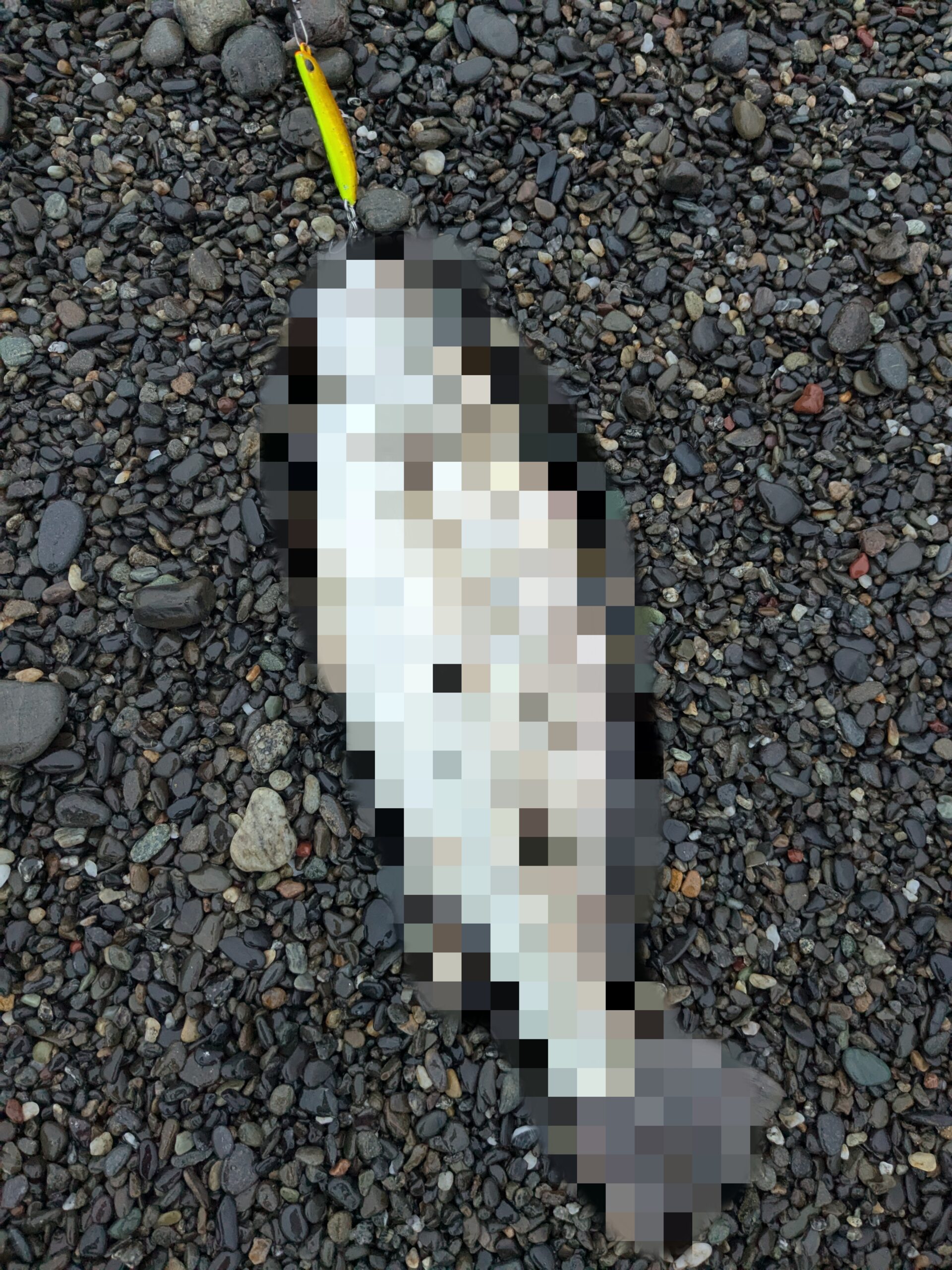 ボトムからの巻き上げでグン!というあたり。最近よく釣れているチビカマスとは引きが違います。デカカマスかなーと期待をしながら引き寄せると…