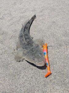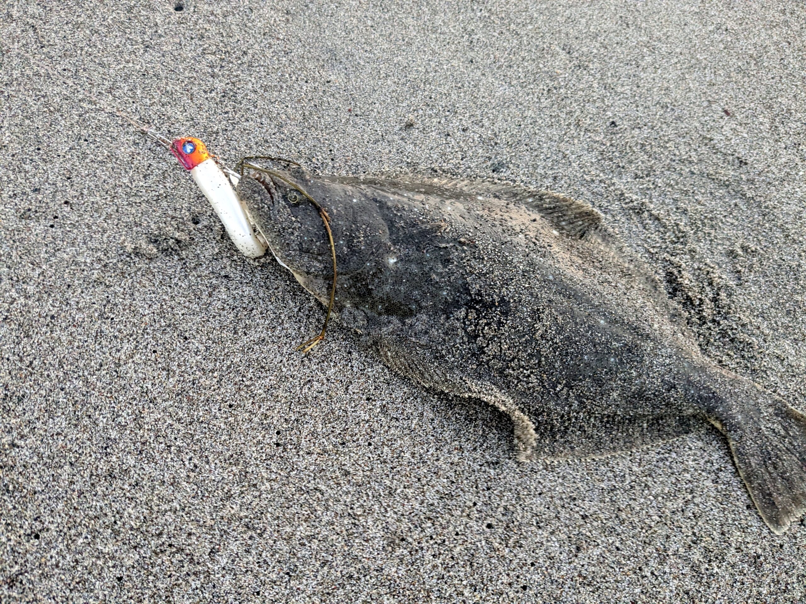 荒々しいバイトと良い引きを味わいながら引き寄せると良いサイズのヒラメでした。