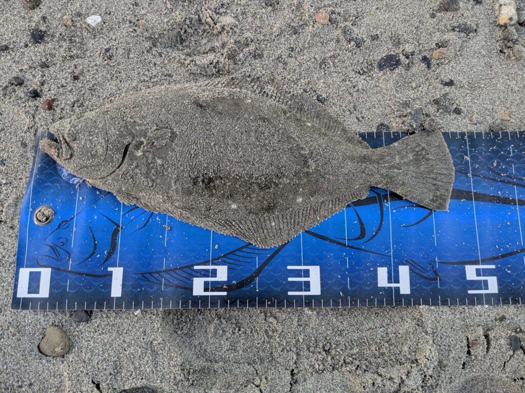 家に帰ってヒラメの胃の中を確認すると5cmほどのカタクチイワシが入っており、それを捕食している最中だったのかもしれません。